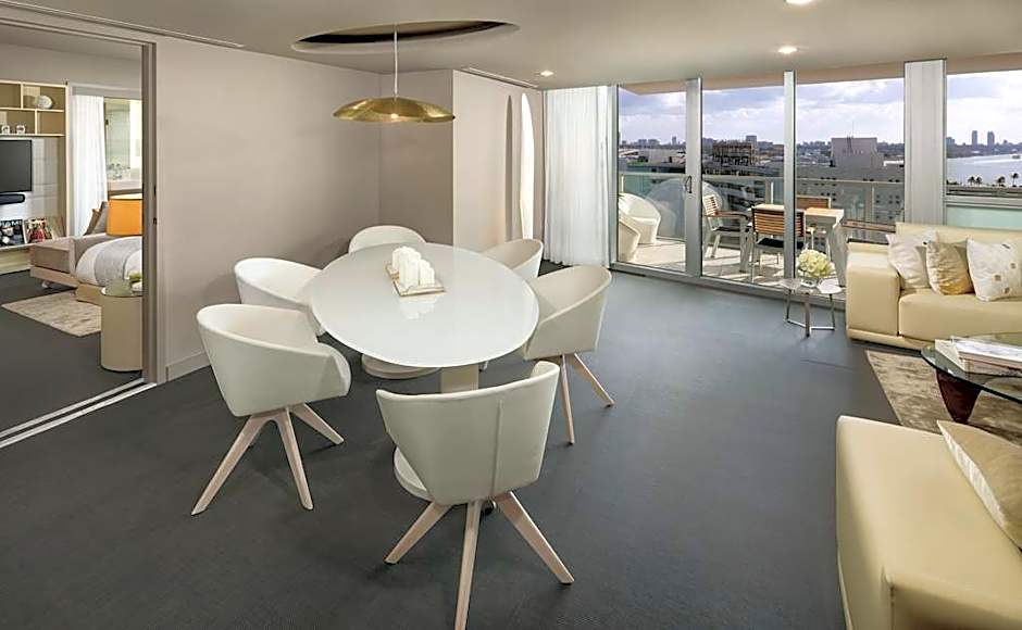 This corner room offers a walk-out balcony with table and views of the Biscayne Bay.